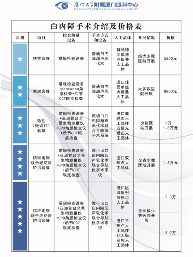 为最大程度满足患者的个性化需求,眼科中心在原有套餐的基础上,更加精细化,根据手术方式、人工晶体的品牌、材质及手术耗品等不同,推出六大白内障手术套餐价,使眼病患者享受指定服务,放心就医,明白消费。